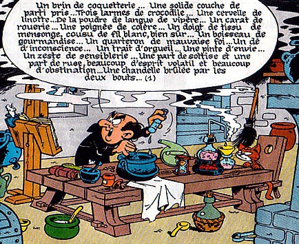 - “一小撮娇气… 一层厚厚的偏见… 三滴鳄鱼的眼泪… 一颗笨鸟的脑子… 一些毒蛇舌头的粉末… 一克狡猾… 一把怒火… 一指(宽)的谎言布料(当然,是用白线缝的)… 一斗贪吃… 四分之一的坏心眼… 一份无知… 一丝傲慢… 一品脱嫉妒… 一丝丝感性… 一份愚蠢和一份狡诈,许多不稳定(易挥发)的灵魂和许多固执… 最后,一支两头烧的蜡烛。”